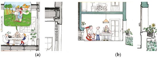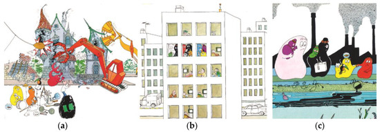 The third illustrated book in the series, “La maison de Barbapapa” (1972), is entirely dedicated to the theme of the house [12]. The Barbapapa, having abandoned the first hut which has become too small, find accommodation in a beautiful abandoned villa from the early 20th century in a quiet charming neighbourhood. The whole family is passionately committed to restoring the old abandoned house and furnishing it with objects of recovery, taken at the flea market. Soon, however, some menacing machines (significantly represented without driver) raze to the ground their new beautiful house to make room for the new “Residence des jardins suspendus”. It is, indeed, a series of anonymous buildings in a modern neighbourhood without qualities (and without green spaces), which effectively represents the worst interpretation of modern style, typical of the speculative building expansion of those years [12] (pp. 8–16) (Figure 2). In the figure the Barbapapa’s family, disconsolate and stacked in her new apartment, appears from some square windows that open into a unadorned and sad front. The life of the other inhabitants also appears to be sad and monotonous, stigmatized by the presence of numerous tv screens that can be seen through the windows. There is clearly no trace of the “jardins suspendus” and Barbapapa decides to leave: in the next illustration thus we can see the family in a merciless procession crossing an industrial polluted suburbs, in search of a place to live [12] (pp. 17–18). The story therefore proposes to young readers, in an indirect but effective way, an explicit critique of the urban transformations of those decades, which is opposed, in the following narrative, by an alternative proposal in terms of architectural design and in terms of the relationship between nature and built environment.