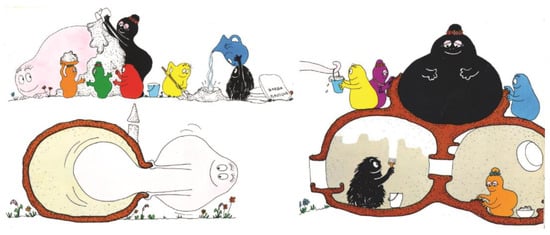 Vittorio Ugo stressed how the sequence with which the child, during his development, meets the topological, projective and finally Euclidean space, is inverted to the chronological order of the historical elaboration of the different geometries. In this sense, the most recent geometries (in terms of scientific elaboration) are also those that intervene first in the relationship that the child establishes with the space around him/her [25] (pp. 50–51). Ugo defined topological geometry as a “touch geometry”, projective geometry as a “vision geometry” and Euclidean geometry as a “mind geometry”. In this sense we can say that geometry in Barbapapa is a “touch geometry”. Virtually a Barbapapa can deform his body into anything without cutting or gluing, so the transformations that the characters make to the cry of “Hula hup Barba-truc!” are very similar to continuous deformations (homeomorphisms) studied by topology, even if they do not always meet the specific criteria (a Barbapapa can easily assume both the shape of a sphere and a torus, without worrying too much about how many sections would be needed to divide it into two bodies). As a result of all these considerations, it can be argued that the geometric concepts indirectly transmitted by illustrations recall, despite the two-dimensional nature of the images, the first spatial experiences inscribed in the child’s history and perhaps also for this reason are so universally loved by children since the very first years. Indeed, these characters have an evident “tactile quality”: their plasticity directly recalls manipulation and for this reason we can also define them as vehicles of topological concepts, as topology is a geometry “of the touch”.