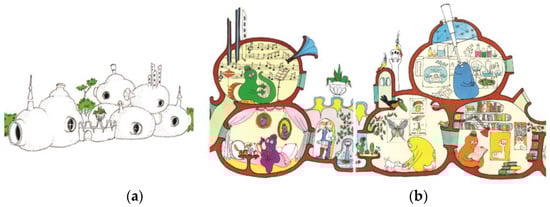 To exemplify the technical content of the drawing since the first books, we can cite the last illustration of the first book, which shows the Barbapapa’s garden pavilion inside his urban context [8] (p. 32). The neighbourhood is represented by a rigorous planivolumetric, with the building’s shadows properly drawn, the indication of roofs pitches and of different roofing membranes, the roads, the agricultural land, gardens and plants. This picture resembles more a technical drawing made by an architect or by a urban planner than a landscape painting and it is different from most children’s illustrations, which usually are less technical and more descriptive, like, for example, a bird’s eye view (Figure 7b). The drawing legibility is certainly facilitated, in this case, by the characters, also present in the picture and very unusually represented in orthographic projection while looking upwards and greeting the young readers from the book page. The interpretation of this image requires a good capacity for spatial abstraction, especially to recognize buildings and in particular the hexagonal pavilion, which is always shown in the previous images of the book by front elevation. Nevertheless, the image seems to be clear to small readers—as has also been observed in specific studies [23] (p. 79)—and this is perhaps also due to its technical accuracy.