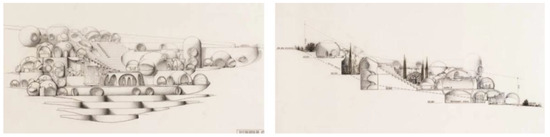 Moreover some reflections from the previous decade are echoed in the project (La maison de Barbapapa is published in 1972), such as those proposed by Archigram with a strong theoretical and provocative connotation and rich in references to pop visual culture and comic aesthetic. The instability, transformability, the possibility of organic growth by aggregation and adaptability to any environment are some of the characteristics that the Barbapapap’s house has in common with some architectural experiments of the time: significant similarities can be found, for example, with the characteristic’ stomach-shaped shell-abitacles’ of Bowellism [15,16] (Figure 5 and Figure 6).