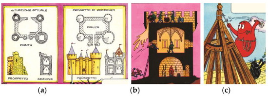 In the comic book story “Le château fort” [21] (pp. 3–22) during an excursion the Barbapapa find a ruined medieval castle and decide to restore it. Along the story the book illustrates through accurate drawings the comparison between the ruined building and the new project. Then indications are given on the historical motivations of the choices of intervention and ancient construction techniques used to reconstruct the missing parts of the building (like roofing) are illustrated. Finally the organization of shows in medieval costume exemplify a strategy for the henancement of built heritage (Figure 7). The restoration design proposed by the fine art “baby-expert” Barbouille basically follows the restoration approach of Viollet-le-Duc, based on in-depth knowledge of the architecture of the time and aimed at bringing the building back to a condition of completeness. However, the story also includes another point of view: that of little Barbidou who is in love with nature and sensitive to the romantic charm of the ruins and suffers to see it alterated by the reconstruction process. Therefore one of the four towers is not restored, providing an example of a ruskinian restauration approach. Although the references are not explicit, the different theoretical approaches and the results of their application are perfectly illustrated and the episode becomes an extraordinary (and unpublished) lesson on architectural restoration.
