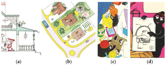 Some countries like France already have a tradition in architectural education for children and there is a growing interest in raising the children’s awareness of architecture, also in the aim of training future aware citizens and promoting the social demand for architectural and urban quality [1,2,3]. Despite this children’s education in architectural disciplines is still an area of experimentation. In the absence of a strong and widespread educational structure, moreover, it is evident that the illustrated book, thanks to its diffusion and to the possibility of influencing spatial thought and the idea of dwelling, is a basic source of education in architectural thought in childhood. The images, in particular, end up being the primary vehicle through which the reflection on space and the relationship between the individual and the places, are proposed. Images often take on a predominant graphic weight and a fundamental role in narration, not only naturally in the comic book, but also in the illustrated book [4].