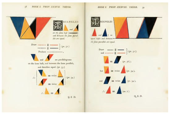 Oliver Byrne, The First Six Book of the Elements of Euclid, Londres, 1847. Book I Prop. XXXVII “Triangles on the same base and between the same parallels are equal”; Book I Prop. XXXVIII “Triangles on equal bases and between the same parallels are equal”.