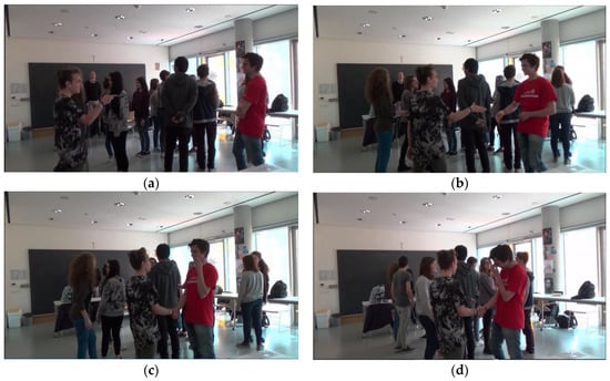 Images-action: (a) visual contact from a distance; (b) coming closer; (c) physical contact; (d) laughter as an event that breaks the structure of the exercise.