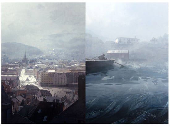 With this in mind, to work in the visualization industry, the artistic and expressive competences—in contrast to popular belief—exponentially enrich the ability to generate computer images, having to face in each project, problems of aesthetic and perceptual nature as well as of software nature. While much of the industry literature places maximum emphasis on technical and technological components needed to produce images, few are the texts and studies that try to understand the origin and artistic capabilities needed in the development of computer-generated imagery (CGI). To better clarify these aspects, after pointing to Fernandez’s work, it is the case to mention the work of other 3D visualization artists, as Nicholas O’Leary, Thomas Dubois and Victor Bonafonte, whose “trigger” in the ideation of a visual project is proportional to the ever-living ability in design, painting and even writing. In the first case, Nicholas is originally from New Zealand, graduated in architecture and professional painter who studied in many ateliers of renowned artists, among which Odd Nerdrum in Norway. His sensibility, creative ability and careful observation of reality and luminous phenomena, as evidenced by the numerous works of on site (On site section collects a rich series of en plein air paintings. Available online: http://nicholasoleary.com/?portfolio_category=on-site) pictorial realism or compositions (Figure 1), are one of the decisive elements within the images produced in the Norwegian Mir (Mir, Norwegian visualization company, globally known for the artistic quality of their images. Among their clients international firms as: Snohetta, Bjarke Ingels Group, Zaha Hadid Architects, Cucinella Architects. Available online: https://www.mir.no) group, of which Nick is today partner.