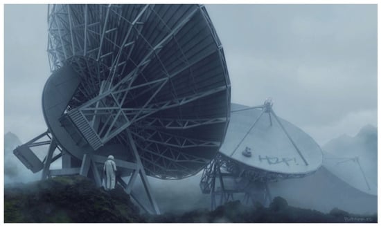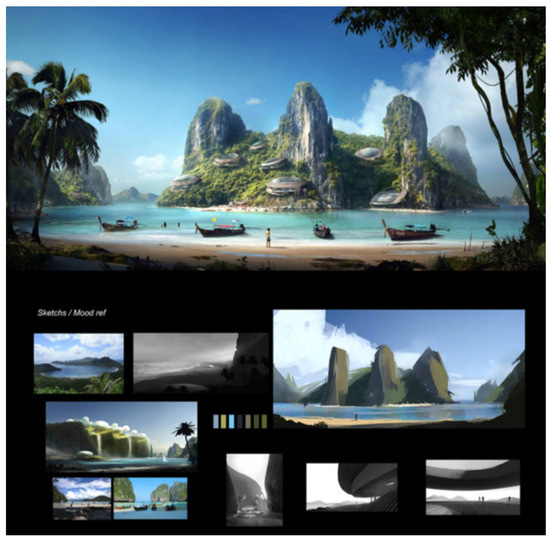 Victor Bonafonte is instead the founder of the Beauty and the Bit (Spanish company from Madrid, founded by Victor Bonafonte and Lina Garau, that works for international firms in the field of architectural visualization. Available online: https://www.beautyandthebit.com) company, and recently author of several matte paintings built for personal projects and situated in fictional landscapes (Figure 2). The study of particular environmental and lighting conditions serves as a compositional exercise for a visual approach to solving problems related to the construction of complex images. These achievements are at the basis of the highly pictorial output of many commercial images of the Spanish group. The iconic imaginary employed, has clear roots in gaming, illustration and in particular in science fiction sagas for cinema, which have made extensive use of matte painting for visual effects (VFX), as in the case of Star Wars and the beautiful paintings produced by Michael Pangrazio. A trait of the technique is to create scenarios that would be impossible to realize or too difficult and expensive to design. The positive outcome of the procedure depended on the painter’s ability to reproduce with extreme competence the backdrops on large glass plates. These plates were placed at a distance from the camera, and in a restricted view, they overlapped to real scenarios, leaving black—today we would define it as alpha channel—the areas intended for actions to be performed by the actors.