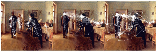 Reproduction from I.E. Repin’s picture “An Unexpected Visitor” and records of the eye movements of seven different subjects. Image from Eye Movements and Vision by Alfred Yanus [7].