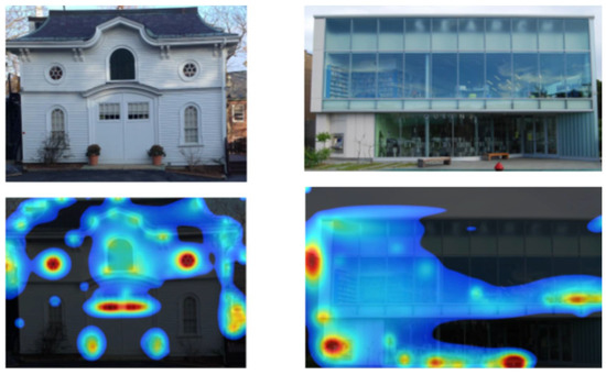 Recordings obtained with a Visual Attention Software on the two photographs of a Carriage House (Massachusetts) on the left and of the Queens Library at Glen Oaks (New York City). The red points are those on which the the observer’s eye stopped for a longer time. Photos and research by Ann Sussman© geneticsofdesign.com [8].