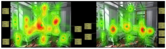 Other studies might fully belong to the definition domain of the CG Artist, in particular you can refer to those conducted on the presence—or absence—of people in the images. Observing the image on Figure 6 (architectural rendering of interiors) the recordings of the eyeball show as the fixation points (red areas) are tied to the presence of people. In this case in the left image the interior is empty: the points of greater visual attention (in red) are distributed in varying degrees on the details of the interior; in the right image people are black transparent silhouettes: the fixation points overlook the architectural parts and focus on the people (despite these are transparent silhouettes). The use of silhouettes is a further proof, compared to the previous recordings in which even real people attracted the attention in the same way, of how humans are attracted to themselves. Taking note of this disinterest (in the non-specialized eye or lacking a specific interest in architectural details) this kind of registration would justify “with scientific rigor” the activity of the perspectivist of the past, devoted to covering or distracting with people (positioned ad hoc with foliage, and vegetation) the less successful design parts. Anyhow, the observations, result of the previous experiments, would explain in more rigorous terms the motivations and the commercial success of a stand-alone category of image rendering that abound with distracting elements and people—from the doubtful taste—, as well as the success of many entourage sites dedicated to collecting and sharing useful png files in photo-insertions.
