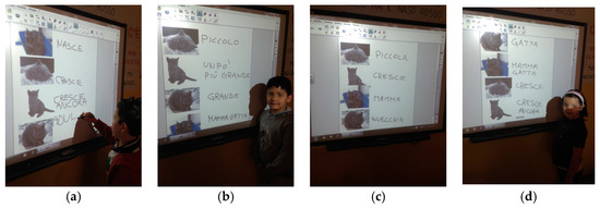 Interactive White Board (IWB) is a common support for displaying images and short texts and surfing the Web or as an interactive surface that allows editing and manipulating objects. The teacher took great care in archiving the didactic materials produced, even in view of possible reuse in subsequent lessons. In almost all cases, the photos were also printed to be glued to children’s notebooks. Textbooks have never been used.