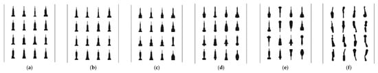 (a–f) 4a: Eliminating the mimetic quality of the vacuum cleaners and the Empire State Building. (b–f) Altering the shapes from simplification (b) to the deconstruction of the mimetic resemblance (f). A Matter of Arrangements, Pauline Guex, MA Thesis, 2013. Archive of the Visual Communication Institute, The Basel School of Design HGK FHNW.