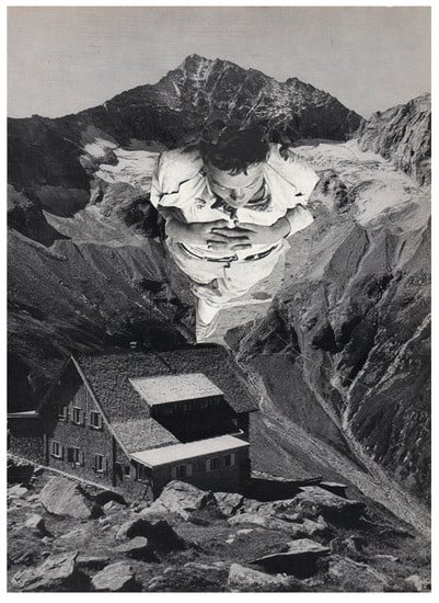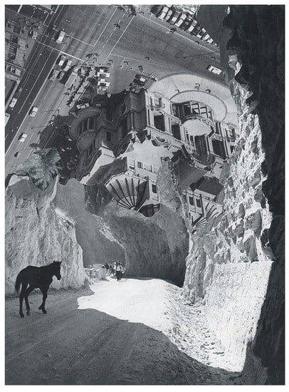 Clement Greenberg’s famous analysis of collage in Cubism (1959) [26] describes the unexpected juxtaposition of the image plane with the three-dimensional space developed around 1911 by Braque and Picasso. Also, the representation and actual objects such as wall papers, newspapers, or wood panels and any painted representation of reality were perceived at the time as unconventional. The shocking effect of the collage was explored more decisively later on by protagonists of Dadaism and Surrealism. To this very day, to see combinations of images that we do not usually experience next to each other and that we do not connect in the archive of image schemas evokes a puzzling effect.