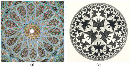 The geometric control of space is probably the primaeval aspiration of humankind on which every science is based. Striving to know our location in the infinite extent of the universe, trying to measure (and thus to quantify) the distances and times that separate objects and events—these were the efforts that led to the acquisition of the earliest rudiments of geometry, aimed at the scientific rationalisation of a context which remained largely unknowable. The idea of a modular space, saturated with an infinitely wide array of elementary and perfectly superimposed notions, has accompanied our vision of the world since the establishment of Euclidean geometry. Mathematical and physical laws are based on the model of a three-dimensional space in which geometric entities are physically or ideally located and through which we rationally explain the movement of bodies and the forces to which they are subject. To this mental image of extreme geometric rigour, which incessantly accumulates intangible spatial units through repeated listing, we can match the elaboration of continuous textures such as the tessellation of the plane and space, infinite possibilities with which surfaces or volumes can be saturated by the repetition of identical forms, arranged in an obsessively ritual order. The theme is widely established in architecture, from the opulent modular decorations that adorn monumental Islamic complexes, to the exquisite examples of Italian Cosmati art (Figure 1a). Recent examples include “intelligent” building structures that can change their configuration in response to varying environmental conditions: continuous surface coatings deform, bend and ripple as they adapt to external factors and redefine, moment by moment, their own image and the shape of the building to which they are applied [6]. In the realm of art, the figure of Maurits Cornelis Escher stands out among the most prolific masters in the exploration-decomposition of the impenetrable infinite. He devoted his research to the theme of the circularity of nature and time, creating a vast collection of works that invoke spatial impossibility and multiple paths of optical illusion and metamorphosis (Figure 1b), in which the replication of simultaneously perceivable forms ascends to an expressive language as they ultimately evolve.