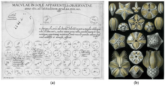 Historically, the generalised ordering of knowledge has been a fundamental human practice, whether for the mere purpose of “archiving” or for the predisposition of data to facilitate logical deduction in view of a subsequent elaboration of theories and interpretations. Simultaneous figures and diagrams have invariably accompanied the recording of observations of natural phenomena and daily events—just think of the earliest forms of Paleolithic cave art. However, this practice consolidates and becomes systematic with the advancement of knowledge and study: simultaneous representation becomes an indispensable visual aid to the coherent formulation of logical and scientific thought. For example, astronomical research, based on the repeated observation and recording of stellar phenomena, uses images conceived as diagrammatical series, in which the comparison between the positions of the stars and their characteristics attempts to uncover the laws governing their motion (aside from their scientific validity, an eloquent example is provided by the graphical sun spot charts drafted by Christoph Scheiner in his scientific treatise Rosa Ursina [8], Figure 2a). Similarly, the studies of naturalists have always relied on the direct verbal and graphical recording of observations. From Linnaeus to Darwin, charts derived from systematic analyses were sketched on margins of diaries and notebooks, confirming the effectiveness of simultaneous observations for deductive purposes. We then have the autotypic prints of Ernst Heinrich Haeckel at the beginning of the 20th century. These are included in the work Kunstformen der Natur [9], in which the naturalist catalogued several hitherto unknown living organisms (Figure 2b).