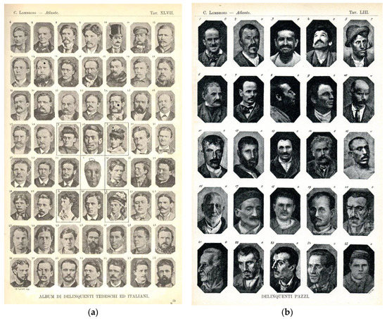 Haeckel is also the author of the first phylogenetic tree [10] by means of which a single synoptic diagram aggregates multiple families of living organisms. He also championed the “recapitulation theory” which attempted to comprehensively formalise the history of the evolutionary process. The tree model derived directly from traditional practice; inspired by the representations of trees of life present in the history of art since ancient civilisations, later in the Middle Ages, it was to give rise to the birth and development of heraldry. By way of affinity, also genealogical trees (for example, those widely used in episcopal genealogy) constitute one of the most popular “simultaneous” representational methods that have survived to modern times. They allow us to readily understand relationships between individuals of the same family or related by acquired lineage [11]. We also have the example of how visual abacuses of characteristics and phenomena formed the basis of modern criminology, although the early theories are now completely discredited. As we know, Caesare Lombroso extrapolated the foundations of criminal anthropology from a vast series of photographic, anthropometric and anatomical comparisons conducted by systematically studying the somatic traits of “delinquent man” [12] and accumulating clues that indicated “anomalous” genetic heritage (Figure 3).