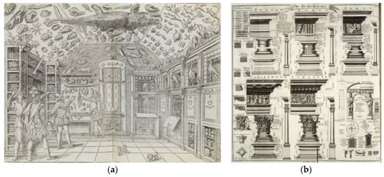 (a) Imperato, F. Dell’historia naturale, 1599, Wunderkammer; (b) Chambers, E. Cyclopedia, 1728, orders of architecture.