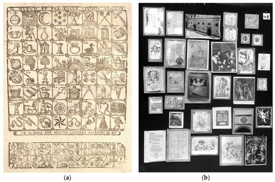 But the urge to catalogue and classify affected the most diverse contexts. During the Renaissance, the sacred and the profane merged in the tradition of games such as tarots, which from the 17th century took on magical and divinatory connotations: from a list of symbols of characters and virtues, they evolved into look-up prospect guides to be consulted as required. Keeping faith with tradition of games (Figure 5a), instead, the venerable Laberinto was developed by the noble Venetian Andrea Ghisi [20]. It consists of a series of 21 abacuses, each consisting of the same 60 symbolic images that are recombined in different sequences: if the player chooses any figure, three questions are sufficient to reveal it with certainty. In chemistry, the study of matter and its alterations by changing its properties and characteristics has its origin in ancient alchemy tables. These symbolic syntheses of the esoteric urge to transform substances into gold evolved into remarkably rational synoptic representations in the modern age, finally taking the form of the periodic table of the elements as we know it today, conceived of by Dmitry Ivanovič Mendeleev in 1869. In art history, the collector’s reasoning is emblematically exemplified by the figurative atlas Mnemosyne composed by Aby Warburg as his last creative endeavour (Figure 5b). The atlas consists of a large number of images that refer to different historical periods and are synoptically grouped by themes (corresponding to as many lectures). Following a long gestation period, the visual catalogue, in its unfinished state, was first reorganised and subsequently, after a period of oblivion, restored to life thanks to publication [21].
