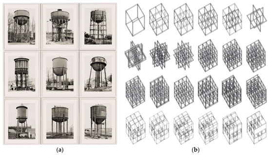 But it is in the conceptual phase of architectural design that the ordered arrangement of compositional possibilities (in effect—design options) is commonly practised: much acclaimed in this sense are the sketches by means of which Louis Kahn explores the possible implications of a technological solution or juxtaposition between volumes or the location of an opening in a wall. A serial design approach facilitates the comparison between various hypotheses, allowing for the best alternative to be chosen. It also aids the design thought process, which is expressed through partial or integral variations of a composition. Finally, we can draft theoretical formulations leading to the generalisation of a method or process. For example, the systematic photographic cataloguing of industrial buildings undertaken by the German couple Berndt and Hilla Becker [24], in which silos, tanks, chimneys and barns become silent protagonists of an almost surreal landscape, has brought widespread attention to the heritage significance of historical industrial assets (Figure 6a); this brought about the firm establishment of industrial archaeology as a discipline in itself and effectively promulgated concrete actions promoting the enhancement of their value. And it is rigorously through the fragmentation of architecture into elementary parts that Aldo Rossi converges to the formulation of the theory of the “Analogical City”, formalising the logical sequence that initially decomposes, then orders, and finally re-composes. The creative dimension of the catalogue-representation can then spill over into the divertissement, an approach which has frequently driven revolutionary methodological ideas and innovative critical positions. Thus we have the radicality of the Istogrammi di architettura (Histograms of Architecture) through which Superstudio reduces space to an isotropy, endorsing the designer’s complete compositional freedom; the rigour of the typological solutions by which Franco Purini classifies spatial possibilities, coding criteria and solutions on which to draw in design practice; the self-referencing conceptual schemes by which Peter Eisenman implements the alienation of the form, provoking its total semantic autonomy (Figure 6b); the obsessive tensile structures through which Frei Otto experiments with infinite declinations on the same functional scheme, hybridising design with combinatorial computation and anticipating the parametric drift of the architectural form. Furthermore, the usefulness of the typological abacus has been effectively exhibited at the 14. MostraInternazionale di Architettura (14th Venice International Architecture Exhibition) in the Central Pavilion [25], where the layout the architectural lexical units of are framed as a series of organised lists broken down by homogeneous categories, with the aim of analytically redefining the typological elements underpinning the design by freezing the instant preceding the spatial composition.