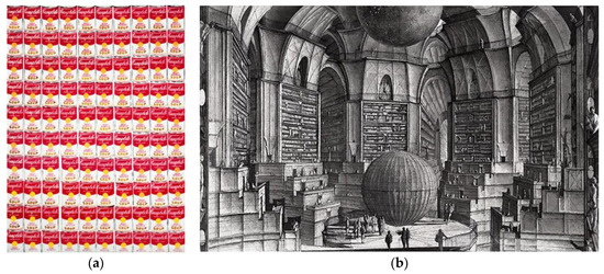 (a) Warhol, A. 100 Cans, 1962; (b) Desmazières, É. La Salle des planètes, En Onze estampes inspirées de la nouvelle de Jorge-Luis Borges La Biblioteca de Babel, 1998, Planche5.
