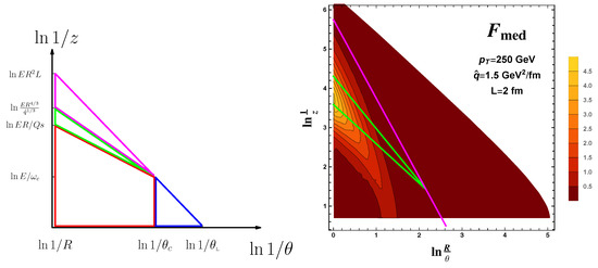 All in all, regions (A.1) and (A.4) support the notion of vacuum-like emissions taking place inside of the medium. Finally, we evaluated numerically the medium modification function in the Lund plane showed in Figure 3 (left panel), see Figure 3 (right panel), with the final goal of checking the factorization derived in Equation (1). The numerical results are in good agreement with the analytically derived ones since the medium modifications are expected to emerge in regions (A.2) and (A.3).