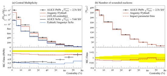 In Figure 2a we show charged multiplicity in the central pseudo-rapidity bin for PbPb collisions compared with the ALICE data [] at TeV. In the same figure we also show results from TeV XeXe collisions []. The dashed red line shows the distribution with the ATLAS centrality definition for PbPb data. Since the solid red line overlaps with the dashed red line it is not distinctively visible in the histogram.