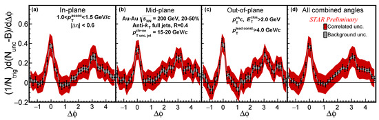 (a) In-plane, (b) mid-plane, (c) out-of-plane, and (d) all combined angles of trigger jets relative to the second-harmonic event plane for corrected correlation function for 1.0 1.5 GeV/c associated hadrons for full jets in Au–Au collisions at GeV for the 20–50% most central events. The red band corresponds to the correlated uncertainty and the gray band corresponds to the RPF background [10] uncertainty which is non-trivially correlated point-to-point.