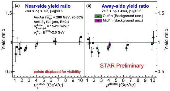 The (a) near-side and (b) away-side out/in and mid/in yield ratios for full jets in Au–Au collisions at GeV for the 20–50% centrality class. The colored bands correspond to the RPF background uncertainty which is non-trivially correlated point-to-point [10]. There is an additional 6% global scale uncertainty.