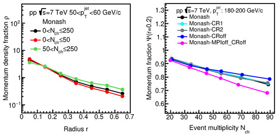 Experimental data from CMS for multiplicity-integrated differential jet shapes (i.e., where events of all charged hadron multiplicities are considered) are well described by all three tunes over a wide range [5,14]. The multiplicity-dependent analysis of the differential jet shapes, however, serve as a sensitive tool to validate simulations, as there are significant differences between predictions using otherwise equally well-preforming tunes [5]. In the left panel of Figure 1 we plot the differential jet structure for low and high charged hadron multiplicity () events separately, and compare them to the multiplicity-integrated curve at a given window. Jets in low-multiplicity events are typically more collimated than in high-multiplicity events, hence the curves intersect each other. The right panel of Figure 1 shows the integral jet structure calculated at with respect to the multiplicity. We can observe a significant effect of the MPI on the jet structures: at higher multiplicities, jets are typically less collimated if MPI is turned off. Note that the contribution of the underlying event has not been separated within the modification of the jet structure [5].