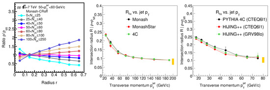 In the left panel of Figure 2 we plot the ratio of differential jet structures for several classes over the multiplicity-integrated jet structure. We observe a common intersection point for all the curves. This suggests a multiplicity-independent characteristic jet-size (). Carrying out the same analysis for different tunes, settings and jet reconstruction algorithms we conclude that depends only on the chosen window [5]. In the central panel of Figure 2 we show the evolution of with respect to the transverse momentum of the jets for different tunes. To make sure is not simply an artefact of Pythia, we conducted crosschecks using events generated by Hijing++. In the right panel we show that there is no difference between the two event generators and there is also no difference between the different PDF sets [7,12] we used.