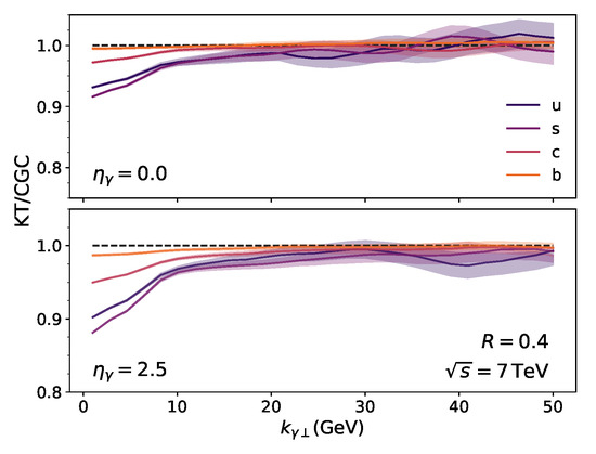 - Benić, S.; Fukushima, K.; Garcia-Montero, O.; Venugopalan, R. Constraining unintegrated gluon distributions from inclusive photon production in proton-proton collisions at the LHC. Phys. Lett. B 2019, 791, 11–16. [Google Scholar] [CrossRef]