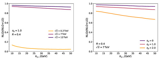 As it was said before, the NLO channel contribution can be greatly enhanced around small-x regimes. This can be achieved by focusing on central rapidities and low momenta, where for the inclusive cross-section. In Figure 2 we can observe that comparison for different energies at a fixed rapidity, , and going to more forward rapidities for a fixed energy, . We observe that at RHIC energies, , the NLO contribution is quite small, maximally of at lower momenta. However, at larger LHC energies, like and , the gluonic processes dominate, as the NLO contribution is more than of the total cross-section. From these results we can conclude that gluons indeed dominate the proton initial states at these high energies.