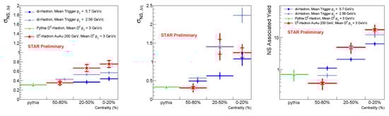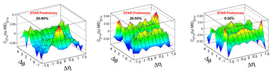 -hadron correlations from Au + Au collisions at = 200 GeV collisions at STAR. The left-most plot is most-peripheral (50–80%), the center is mid-central (20–50%) and the right-most plot is most-central (0–20%).