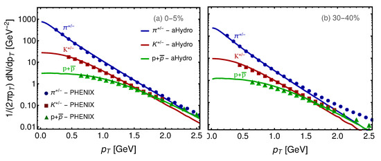 In Figure 1, we show the spectra of pions, kaons, and protons as a function of the transverse momentum . In the left panel, we show the 0–5% centrality class while in the right panel we show the 30–40% centrality class. From both panels, we see that aHydroQP agrees with the data quite well.