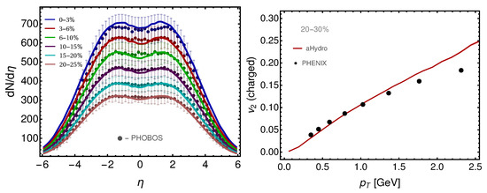 Next, in Figure 2a, we show comparisons of the charged particle multiplicity as a function of pseudorapidity predicted by 3+1d aHydroQP and experimental data. As can be seen from the figure, in a wide range of centrality classes, the agreement between aHydroQP and the experimental results is quite good. In Figure 2b, we present the elliptic flow for charged particles as a function of transverse momentum in the 20–30% centrality class. We find that our model shows good agreement with the experimental results. The data in the left and right panels are from the PHOBOS collaboration [20] and the PHENIX collaboration [21], respectively.