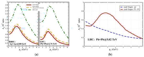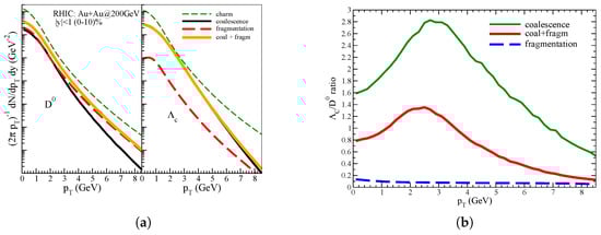 In Figure 1b we show the results for the ratio. Coalescence by itself predicts a rise and fall of the baryon/meson ratio, the inclusion of fragmentation reduces the ratio, and we can see a quite good agreement with the experimental data in the peak region (orange solid line) in comparison with the STAR experimental data shown by circle [,]. In Figure 2a is shown the comparison between RHIC and LHC for the ratio. Coalescence predicts a similar ratio for both energies, and the same for fragmentation, because the ratio established from the experimental measured fragmentation fraction remains the same changing the collision energy. Even if the only coalescence and the only fragmentation ratio remain similar, the combined ratio is different because, for each species, the production ratio between coalescence and fragmentation is smaller at LHC than at RHIC. Therefore, at LHC the larger contribution in particle production from fragmentation [,] leads to a final ratio that is smaller than at RHIC. A baryon over meson ratio that is so large at low momenta, can lead also to a smaller in this region. It is consequence of the charm quark number conservation and the dominance of D mesons in the total particle production, in collisions.