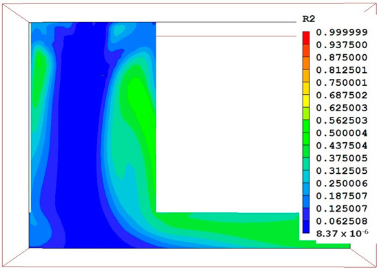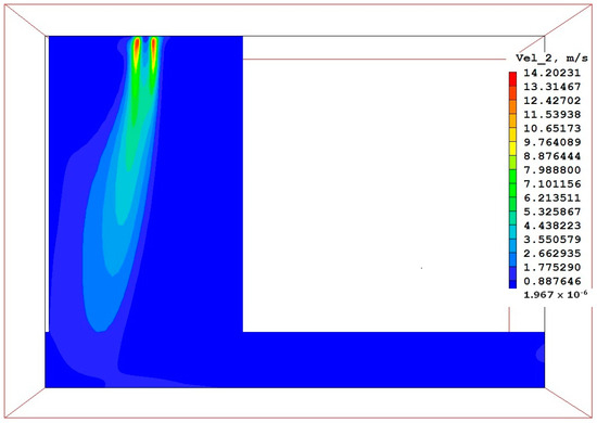 From the obtained velocity distributions, the movement of particles in the flash furnace was analyzed. An example of the velocity distribution for particles of 70 μm is shown in Figure 3. The concentrate particles move, creating a central stream, heading towards the side wall of the settling tank, where some of them fall and the rest move along the settling tank.