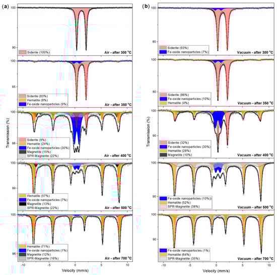 57Fe Mössbauer spectra of siderite sample Sd1 heated at different temperatures in the air (a) and vacuum (b) atmosphere for one hour. Fitted subspectra (colored lines), their phase assignment, and contributions are shown on each spectrum.