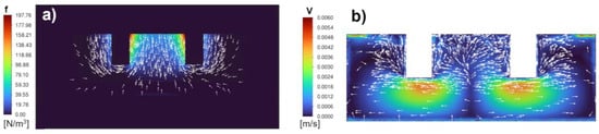 Figure 2. Results obtained from the simulation: (a) volume density of Lorentz force f; (b) velocity distribution v in the slag volume.