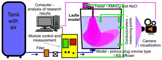 The steel ladle model was equipped with appropriately prepared models of the porous plug and the KS diffuser, also made on a linear scale of SL = 1:3.4. These models were placed on the radius of the bottom of the ladle at a distance of 2/3 of its length from its axis. The gas flow was regulated using a precise regulator system equipped with an additional rotameter. A special system was designed to inject the required portion of the tracer. The system has been designed in such a way that it is possible to introduce the tracer into the model liquid along with the stream of injected gas. Figure 1 shows a diagram of the test stand.