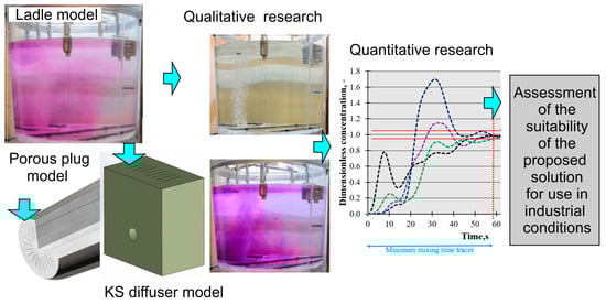 Due to the results obtained, the research was carried out using a water model of a steel ladle was of a double nature—qualitative and quantitative. The result of the qualitative research was the visualization of the process of mixing the model liquid and, based on it, the assessment of the mechanism of formation of a cone of gas bubbles (gas column). During these tests, the degree of gas dispersion in the model liquid was also determined. As a result of quantitative tests, RTD mixing curves and, based on them, the minimum values for the mixing time were determined. The minimum mixing time was adopted as a criterion for assessing the ability of the tested system to homogenize the model liquid. Figure 2 shows a schematic diagram of the research program.