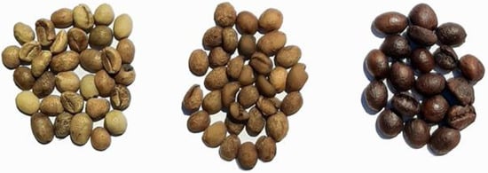 Robusta coffee beans: raw/green (left), processed (middle); roasted (right). Figure was reproduced with the permission from Bioroots ApS (Gilleleje. Denmark).