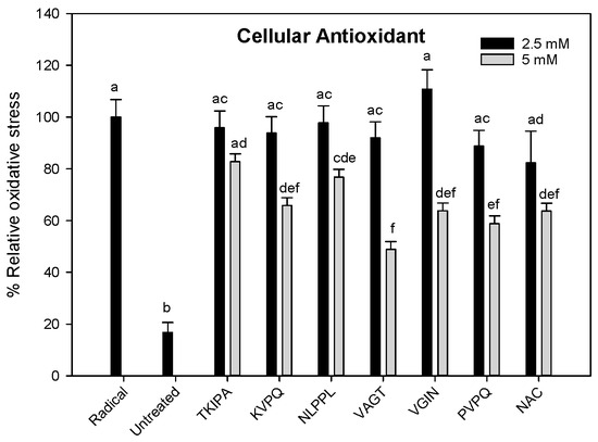 Relative oxidative stress in C2C12 (8 × 104 cells/well) after 1 h exposure to synthesized peptides. Radical = cells treated with DMEM + DCFH-DA + ABAP, Untreated = cells treated with DMEM + DCFH-DA, NAC = cells treated with DMEM + N-acetylcysteine + DCFH-DA + ABAP. Experiments were performed in triplicate. Different letters indicate significant difference (p < 0.05).
