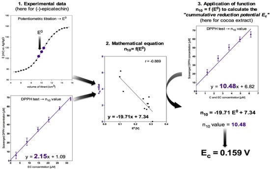 We propose three-step approach explained in detail in Figure 1, in which pure redox active compounds are used to provide experimental data (step 1) needed to generate the mathematical formula describing the relationship between E0 and n10 (step 2). In this paper, the linear approximation was applied, however once more data for a larger number of compounds is available, the function n10 = f (E0) may become more complicated. This function equation, when published may be generally used by anybody interested. Finally, in the step 3, the n10 value is determined for any sample of interest with the use of strictly defined uniform DPPH test protocol and based on this determination, cumulative reduction potential Ec calculated from the n10 = f (E0) function equation. We named this parameter “cumulative”, because it reflects all the redox interactions taking place in natural plant sample containing a mixture of redox active ingredients characterized by divergent electrochemical properties and present in various concentrations.
