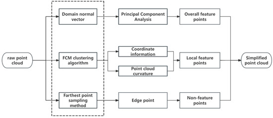 To address the limitations of the aforementioned algorithms, this paper proposes a point cloud reduction algorithm based on the feature extraction of neighborhood normal vectors and FCM clustering for feature extraction. The algorithm begins by employing the farthest point sampling method to extract edge points from the model. Then, it constructs a KD-tree for the remaining point cloud data and utilizes domain normal vectors to extract overall feature points. Point cloud curvature, coordinate information, and geometric attributes are used as clustering features for the FCM algorithm to extract local feature points. Finally, edge points, overall feature points, and local feature points are merged to achieve point cloud simplification. This algorithm is conceptually simple, effectively retains key feature information from the point cloud data, and significantly reduces data redundancy, leading to a substantial improvement in the efficiency of 3D reconstruction. The algorithm flow is shown in Figure 1.