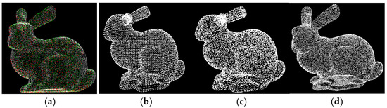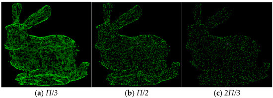 To verify the effectiveness of the point cloud reduction algorithm proposed in this paper, the classic “bunny” point cloud dataset from Stanford University, consisting of 35947 points, is used as the experimental data. The algorithm is implemented using Python, and the algorithm is compared with the uniform grid method, random sampling method, and curvature sampling method. Considering that the setting of the threshold θ affects the extraction effect of the overall feature points when extracting the overall feature points, this paper uses the normal vector threshold of Π/3, Π/2, and 2Π/3 to extract the overall feature points. The extracted overall feature point effect diagram is shown in Figure 2. As shown in Figure 2, the threshold significantly impacts the number of point clouds; a larger threshold results in fewer extracted point clouds, which may lead to the loss of crucial information in the point cloud model. When the threshold is set below Π/2, more points are classified as feature points. While this approach captures additional details, it also results in an excessive number of point clouds being extracted, thereby compromising the effectiveness of point cloud simplification and reducing the efficiency of subsequent reduction processes. Therefore, this paper sets the threshold to Π/2 to extract the overall feature points. Figure 3 shows the reduction results of the bunny model using both the proposed algorithm and traditional algorithms. Table 1 compares the efficiency of the bunny model using the algorithm in this paper with the uniform grid method, random sampling method, and curvature sampling method.