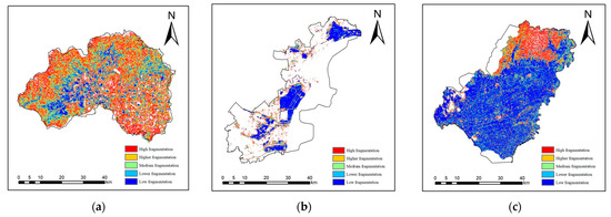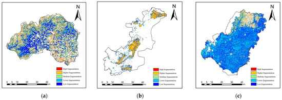 (a) Changping District distribution map of land fragmentation; (b) Binhai New Area distribution map of land fragmentation; and (c) Hulin City distribution map of land fragmentation.