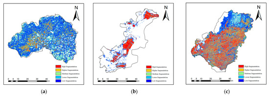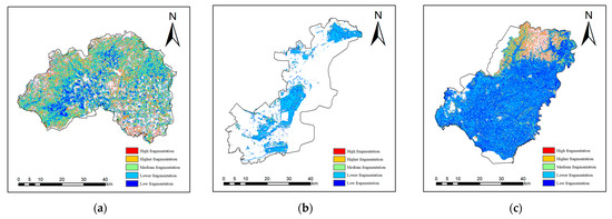 (a) Changping District distribution map of distribution fragmentation; (b) Binhai New Area distribution map of distribution fragmentation; and (c) Hulin City distribution map of distribution fragmentation.