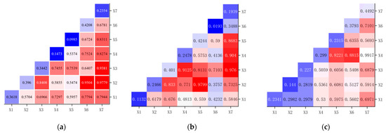 (a) Changping District interaction detection results; (b) Binhai New Area interaction detection results; and (c) Hulin City interaction detection results. Different colors represent different levels of interaction intensity. Specifically, the red portion indicates a very strong interaction, while the blue portion signifies a weaker interaction. The other colors, situated between red and blue, represent a gradual transition in interaction intensity from high to low.