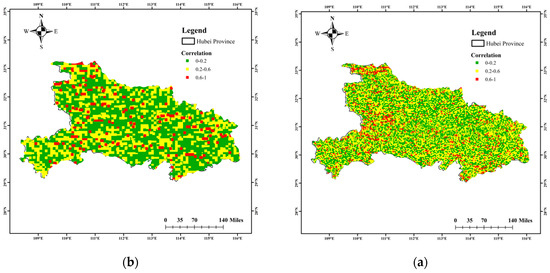 In this study, DEM data, slope data, and land cover data were classified according to relevant standards, and data with relatively small spatial areas were excluded to obtain results at different spatial scales. The DEM data were classified into four categories, slope data into six categories, and land cover data into four categories. The specific classification results are shown in Table 2. Additionally, we categorized the correlation coefficients into four classes based on their values. The classification results are shown in Table 3.