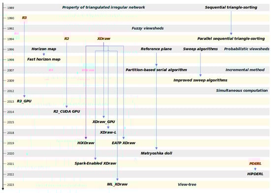 In addition, scholars have proposed the reference surface viewpoint algorithm, irregular triangle mesh viewpoint algorithm, sequential triangle sorting method, and others [18,19,20,21,22]. However, many of these early algorithms are highly computationally expensive due to the interpolation involved, making visual domain calculations time-consuming. As a result, scholars have focused on improving these classic algorithms by reducing their complexity and enhancing computation speed. For instance, the horizon algorithm [23], DEM block division serial algorithm [24], raster size incremental method [25], and the Matryoshka doll algorithm [26] are all efforts to optimize visibility calculations for large-scale terrain analysis. High-performance computing methods, including GPU-based parallelism [27,28,29,30,31,32,33,34] and distributed computing frameworks like Apache Spark [35,36], have further enhanced the efficiency of visibility analysis.